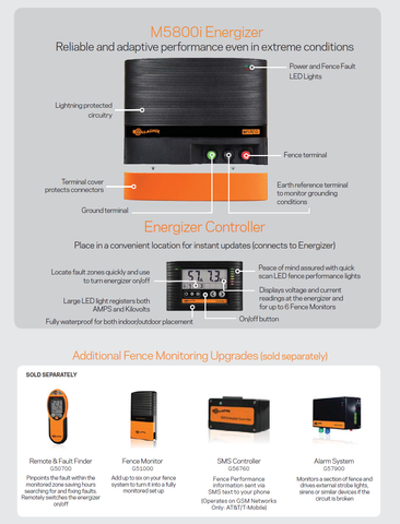 The M5800i energizer has 58 joules of stored energy and is suitable for fencing all types of animals on up to 2700 acres. The intelligent i Series system provides fence information at a glance, informing you of any problems immediately so you can take action to save time and money.